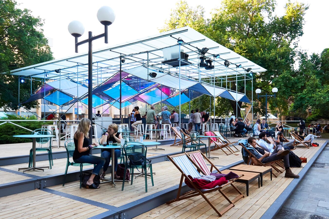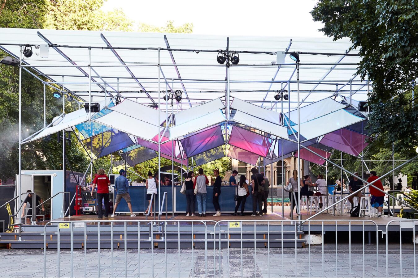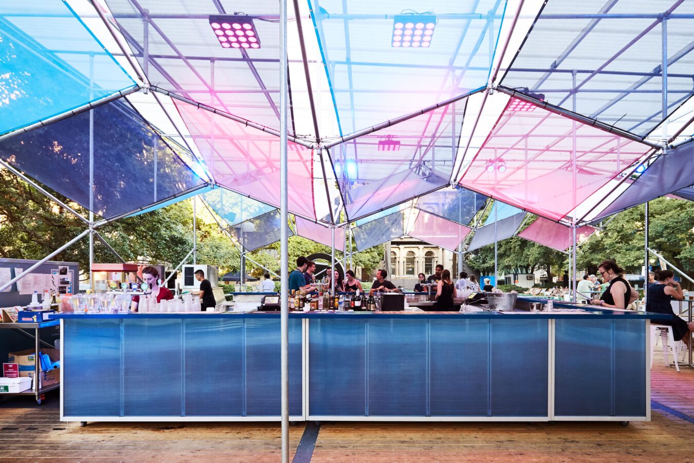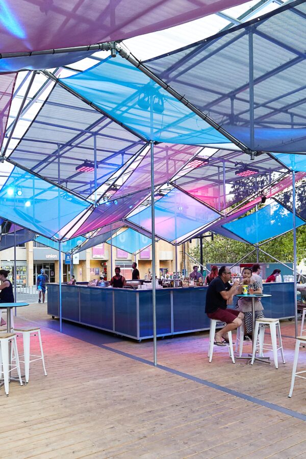 The Shimmerlands Pavilion is a modular, temporary structure that disrupts its typically staid environment with a geometrical play of light and colour. Across two months in summer 2017/18, the pavilion served as festival hub (and bar) for the Shimmerlands festival’s program of music and outdoor cinema at the University of Melbourne. The brief was for a custom solution that would create a distinct sense of spectacle and excitement — and could be erected in ten days, then swiftly disassembled in just four.