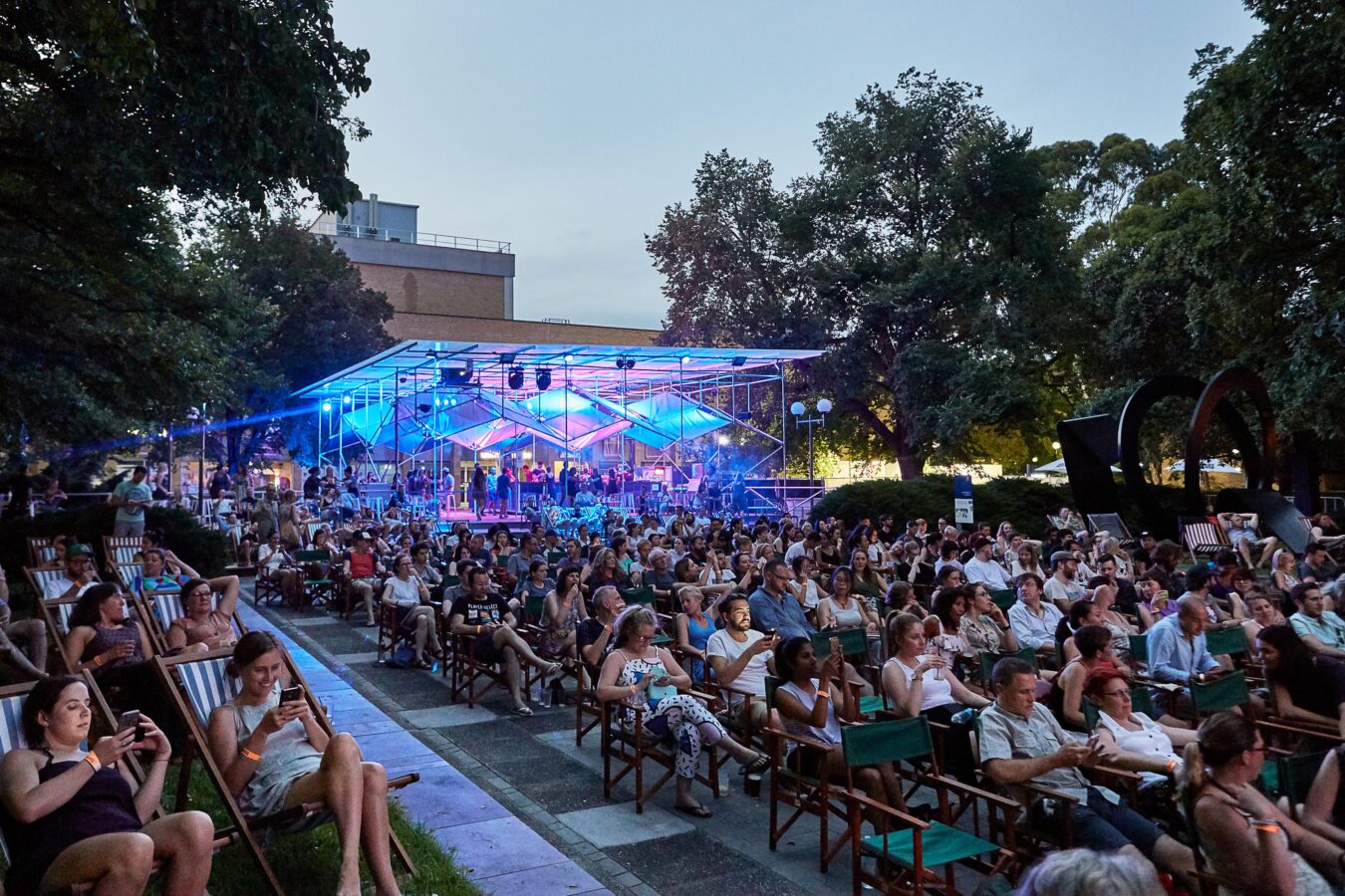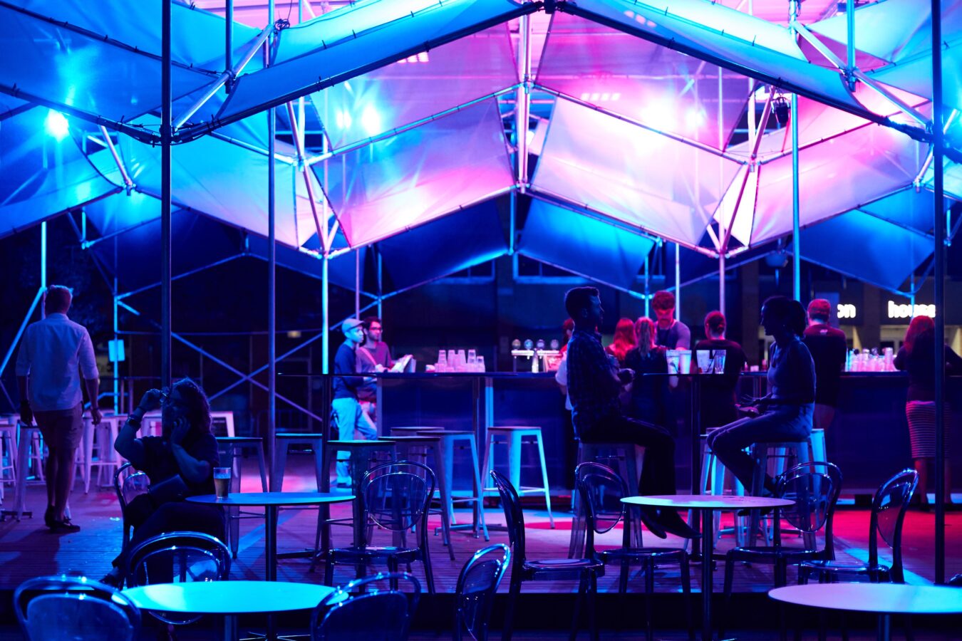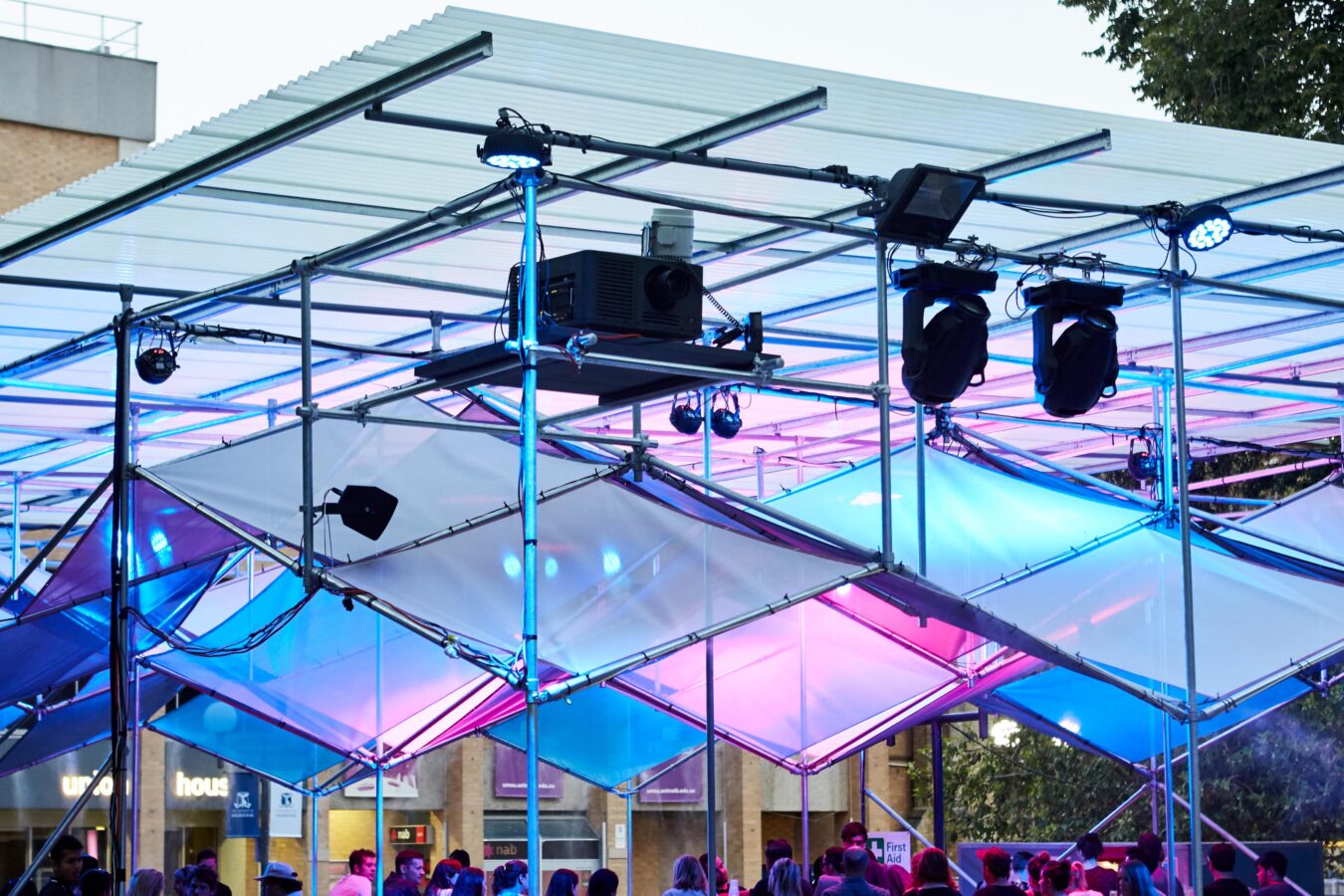 The Shimmerlands Pavilion is a modular, temporary structure that disrupts its typically staid environment with a geometrical play of light and colour. Across two months in summer 2017/18, the pavilion served as festival hub (and bar) for the Shimmerlands festival’s program of music and outdoor cinema at the University of Melbourne. The brief was for a custom solution that would create a distinct sense of spectacle and excitement — and could be erected in ten days, then swiftly disassembled in just four.