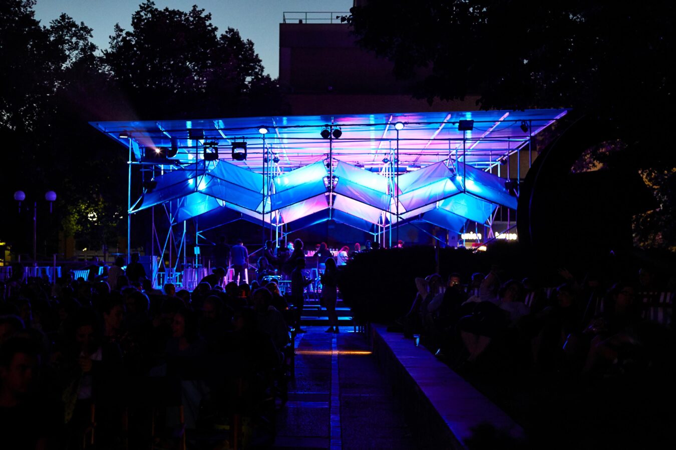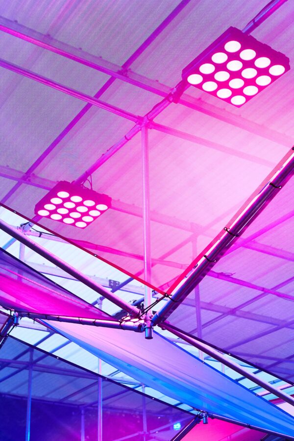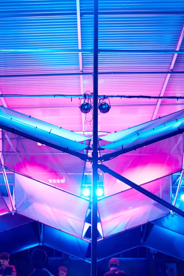 The result was an expressive yet modular design which adopted proprietary components for speed of construction. The design is fully demountable and reusable, which allows it to be re-erected and altered to suit future events. Of particular note are the peaks and valleys of the ceiling ‘veil’ — an independent sculptural form that allows a level of transparency and porosity — as well as the eponymous “shimmer” effect after dark.